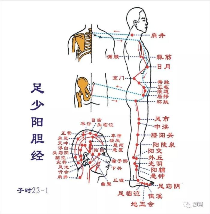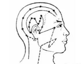 【取穴方法】循行部位起于目外眦(瞳子髎穴),上至头角(颌厌穴),下行到耳后(完骨穴),再折回上行,经额部至眉上(阳白穴),又向后折至风池穴。